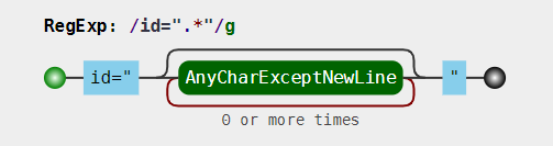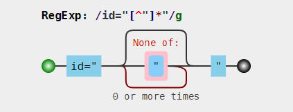 //尝试二: const r = /id=".*?"/; const string = '<div id="container" class="main"></div>'; console.log(string.match(r)[0]); //id="container"优化如下,通过使用^(脱字符)来保证两个双引号中间不会出现第三个双引号: