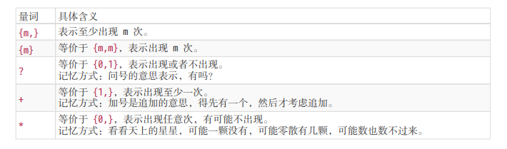 量词也称重复。在掌握 {m,n} 的准确含义后,只需要记住一些简写形式。