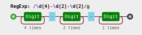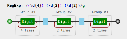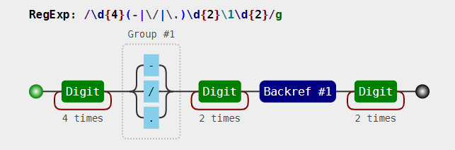 例如:写一个匹配 2019-11-25 或 2019.11.25 或 2019/11/25 这三种格式日期的正则。// 常见,无法保证分隔符前后一致 const regex = /\d{4}(-|\/|\.)\d{2}(-|\/|\.)\d{2}/; const string1 = "2019-12-31"; const string2 = "2019/12/31"; const string3 = "2019.12.31"; const string4 = "2019-12/31"; console.log(regex.test(string1)); // true console.log(regex.test(string2)); // true console.log(regex.test(string3)); // true console.log(regex.test(string4)); // true // 反向引用 const regex = /\d{4}(-|\/|\.)\d{2}\1\d{2}/; const string1 = "2019-12-31"; const string2 = "2019/12/31"; const string3 = "2019.12.31"; const string4 = "2019-12/31"; console.log(regex.test(string1)); // true console.log(regex.test(string2)); // true console.log(regex.test(string3)); // true console.log(regex.test(string4)); // false反向引用可视化形式: