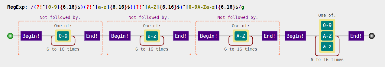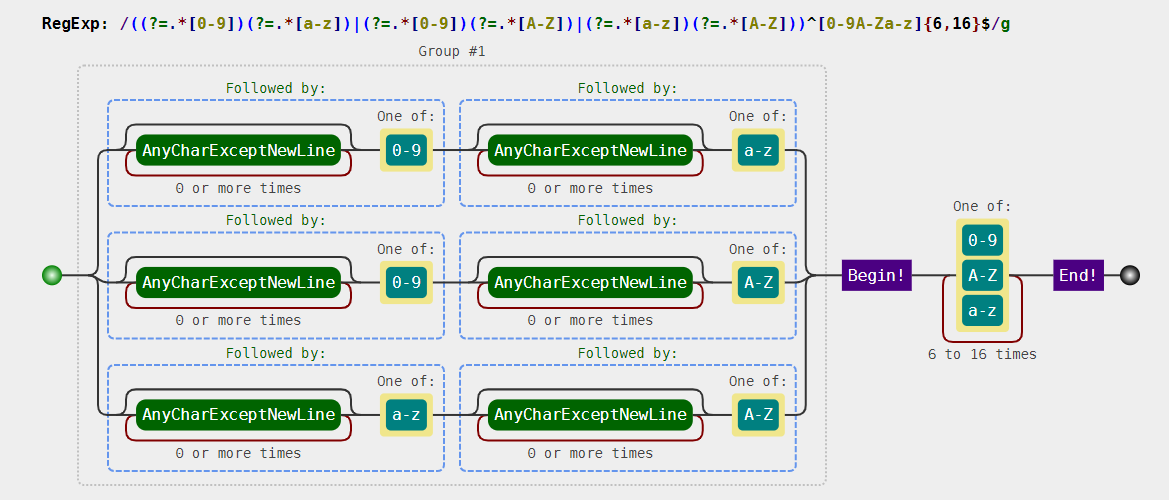 const regex=/(?=.*[A-Z])(?=.*[a-z])(?=.*[0-9])^[0-9A-Za-z]{6,16}$/; - 以上的 4 种情况是或的关系(实际上,可以不用第 4 条)。