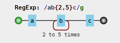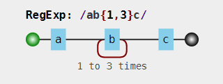 假设正则表达式/ab{1,3}c/,其中子表达式b{1,3}表示 “b” 字符连续出现 1 到 3 次。其可视化形式为: