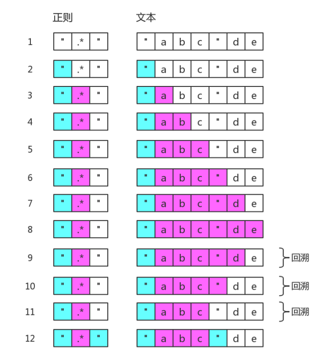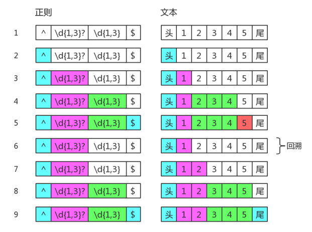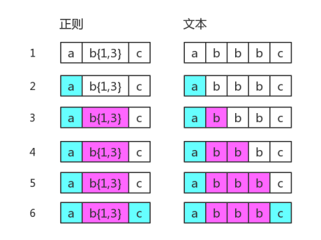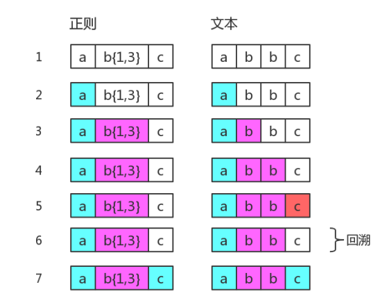 图中第 5 步有红颜色,表示匹配不成功。此时b{1,3}已经匹配到了 2 个字符 “b”,准备尝试第三个时,结果发现接下来的字符是 “c”。那么就认为b{1,3}就已经匹配完毕。然后状态又回到之前的状态(即第 6 步与第 4 步一样),最后再用子表达 c 去匹配字符 “c”。当然,此时整个表达式匹配成功了。图中的第 6 步,就是“回溯”。