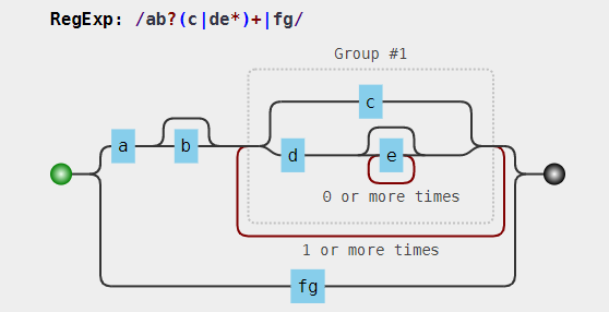 上述操作符的优先级从上至下,由高到低。举一个例子,/ab?(c|de*)+|fg/,其可视化形式: