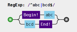 因为是要匹配整个字符串,我们经常会在正则前后中加上锚^和\$。比如要匹配目标字符串 “abc” 或者 “bcd” 时,如果一不小心,就会写成/^abc|bcd$/,事实上它匹配的模式是如下图,这是因为位置字符和一般字符的优先级要比分支结构要高,所以上述正则表达拆分开是^abc和bcd$两个部分。正确的表达式应该是/^(abc|bcd)$/,因为括号的优先级比位置和一般字符优先级高,所以括号中的内容是一个整体。