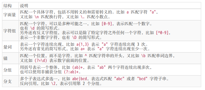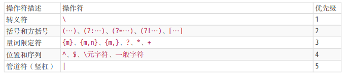 在正则表达式中,操作符都体现在结构中,即由特殊字符和普通字符所代表的一个个特殊整体。JavaScript 正则表达式中的结构有:字符字面量、字符组、量词、锚、分组、选择分支、反向引用。具体含义以及涉及到的操作符如下: