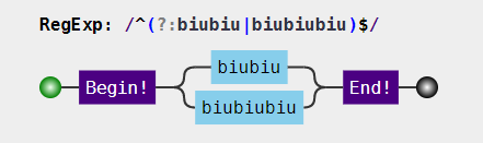 const string1 = "biubiu"; const string2 = "biubiubiu"; const regex = /^(?:biubiu|biubiubiu)$/; // 无回溯 console.log(string1.match(regex)); // 有回溯 console.log(string2.match(regex)); // => [ 'biubiu', index: 0, input: 'biubiu', groups: undefined ] // => [ 'biubiubiu', index: 0, input: 'biubiubiu', groups: undefined ]