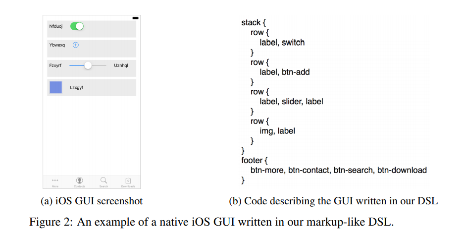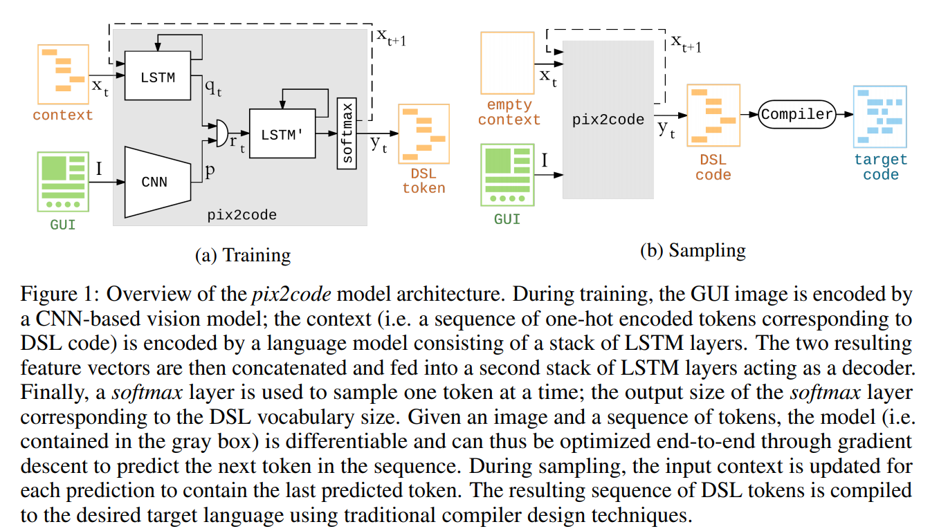 该模型一共可以分为两个部分:训练和采样。在训练阶段,会利用一个基于 CNN 的视觉模型对 GUI(Graphical User Interface) 图片进行编码。而输入图像对应的上下文(context,即与 DSL 代码相对应的 one-hot 编码 tokens 序列)则由包含多个 LSTM(Long short-term memory) 结构的语言模型进行编码。将得到的两个特征向量(feture vectors)进行级联然后喂进第二个具有多个 LSTM 结构的进行解码。最后由 softmax 层一次生成一个用于采样的 token。softmax 层输出的尺寸和 DSL 的词汇数量保持一致。 对于给定图像和 token 序列,改模型(即包含在灰色框中的模型)是可区分的,因此可以通过梯度下降进行端到端优化以预测序列中的下一个 token。在采样阶段,最开始出入的是空白的上下文(context)和 GUI 图像,上下文(context)通过在每一次预测之后进行更新来包含最后预测的 token。最后会生成一个与该 GUI 图像最相关的 DSL 代码,并使用传统的编译器设计技术将生成的 DSL token 序列编译为所需的目标语言。