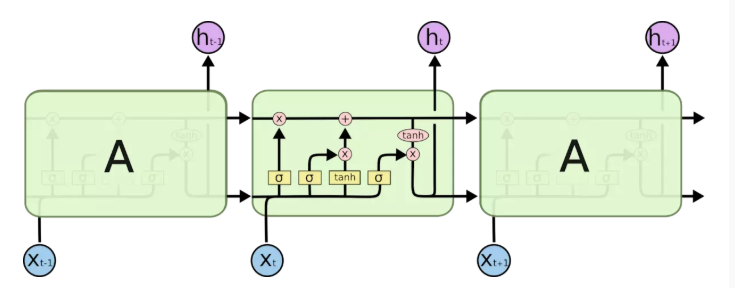 由图和公式可以看出,在 RNN 中是将过去的输出和当前的输入 concatenate 到一起,通过 tanh 来控制两者的输出,它只考虑最近时刻的状态。也就是说,RNN 本时刻的隐藏层信息只来源于当前输入和上一时刻的隐藏层信息,没有记忆功能。而 LSTM 专门设计用来避免长期依赖问题的 RNN 网络,对 LSTM 来说记住长期的信息是一种默认行为。LSTM 网络结构如下图所示: