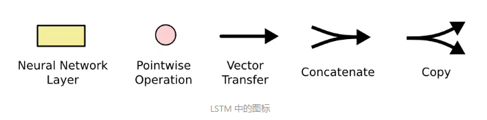 可以看出,LSTM 的网络结构相比于 RNN 复杂了很多,而且包含多种图标,每一个图标的意义如下图所示。每一条黑线传输着一整个向量,从一个节点的输出到其他节点的输入。粉色的圈代表按位 pointwise 的操作,诸如向量的和,而黄色的矩阵就是学习到的神经网络层。合在一起的线表示向量的连接,分开的线表示内容被复制,然后分发到不同的位置。