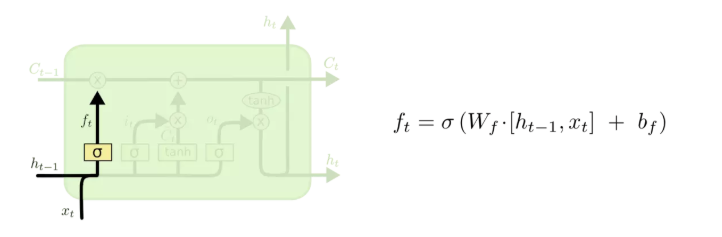 遗忘门决定我们会从细胞状态中丢弃什么信息。实现方式是结合上一层隐藏层的状态值和当前层的输入,通过 sigmoid 函数(σ),决定舍弃哪些旧信息。sigmoid 输出的是(0,1)范围内的数值,用于描述每个部分有多少量可以通过。0 代表“不许任何量通过”,1 就指“允许任意量通过”。遗忘门结构和计算方式如图所示。