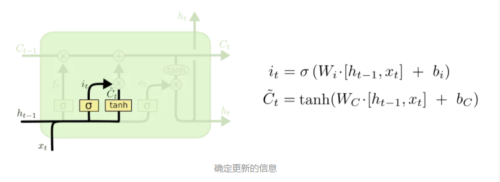 输入门是确定什么样的新信息被存放在细胞状态中。这里包含两个部分。第一,sigmoid 层称 “输入门层” 决定什么值我们将要更新。然后,tanh 层创建一个新的候选值向量$\tilde{C}_t$,会被加入到状态中。输入门结构和计算方式如图所示: