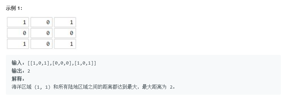 最简单的办法,即求出每一个海洋区域(grid[i][j] == 0 的区域)的「最近陆地区域」,然后记录下它们的距离,然后在这些距离里面取一个最大值。