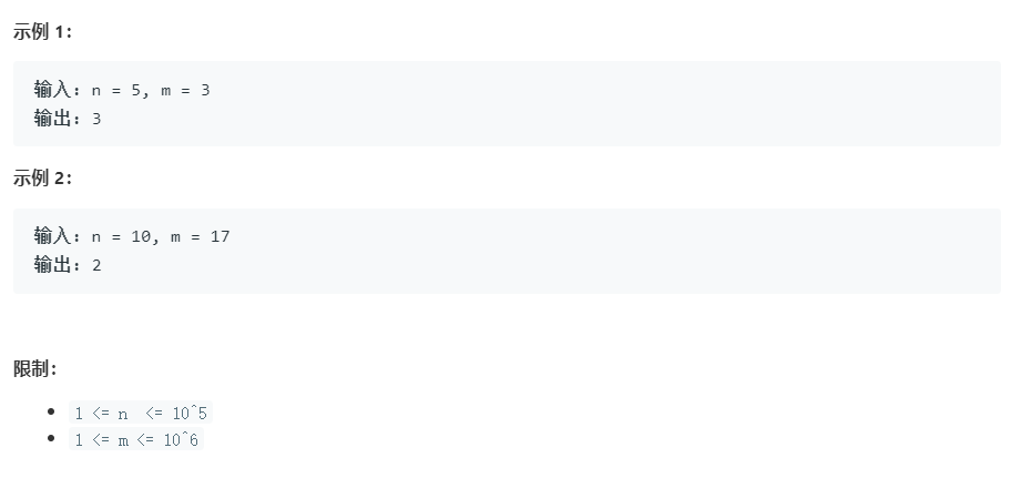 当序列长度为 1 时,一定会留下唯一的那个元素,它的编号为 0,因此 lastRemaining(1, m)=0。由 lastRemaining(n, m) = (m + lastRemaining(n-1, m)) % n 可得迭代解法。