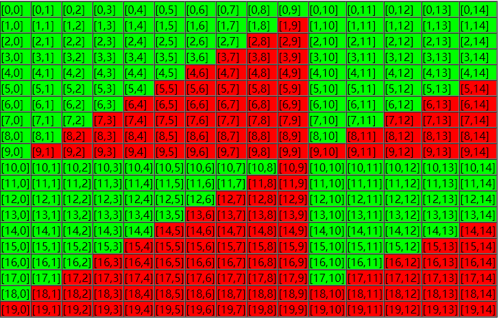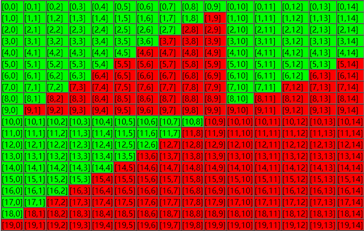m=20, n=15, k=9 的情况(转自 leetCode),绿色区域表示能走的地方,红色区域表示不能走的地方