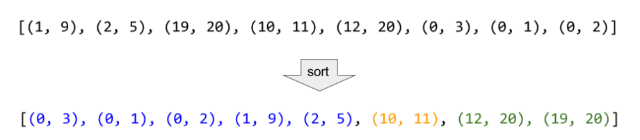 按照区间的左端点排序,那么在排完序的列表中,可以合并的区间一定是连续的。如下图所示,标记为蓝色、黄色和绿色的区间分别可以合并成一个大区间,它们在排完序的列表中是连续的: