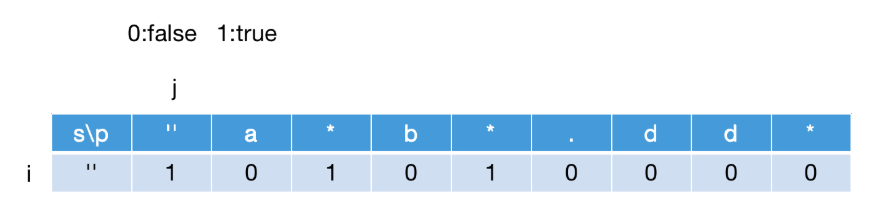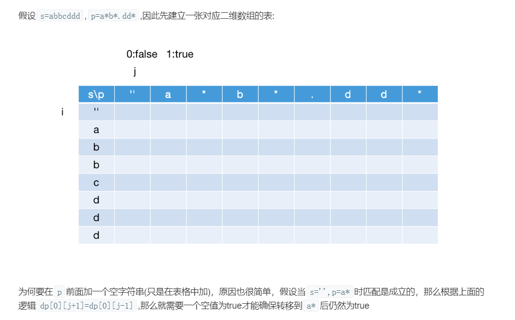 注意:上图中 p[j]=”.”时也为 false,这是因为”.”可以匹配任意字符但是不能为为空,因此也为 false。上诉步骤代码如下:dp[0][0] = true; for (let i = 1; i < p.length; i++) { if (p[i] === "*") { dp[0][i + 1] = dp[0][i - 1]; } }注意:dp[i][j]表示的是 s 的前[i-1]个字符与 p 的前[j-i]个字符的匹配结果