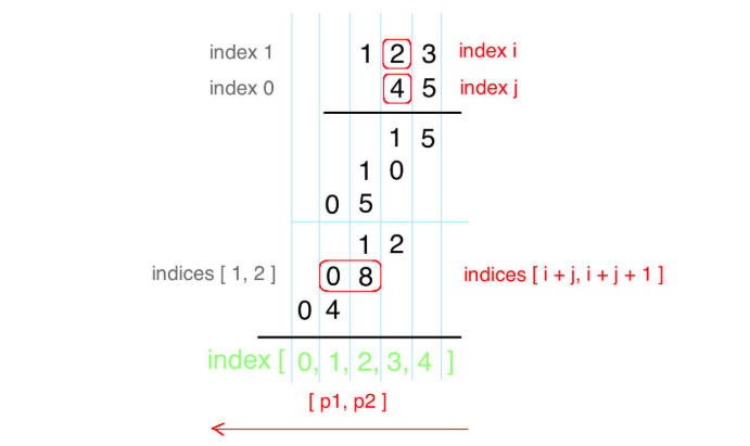 num1[i] x num2[j] 的结果为 mul(位数为两位,”0x”,”xy”的形式),其第一位位于 res[i+j],第二位位于 res[i+j+1]。