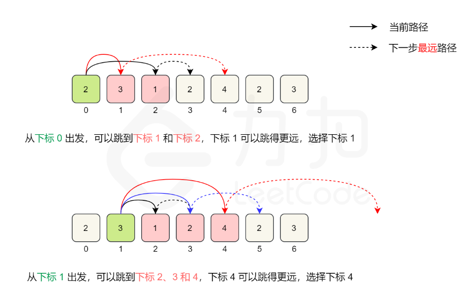 - 例如,对于数组 [2,3,1,2,4,2,3],初始位置是下标 0,从下标 0 出发,最远可到达下标 2。下标 0 可到达的位置中,下标 1 的值是 3,从下标 1 出发可以达到更远的位置,因此第一步到达下标 1。